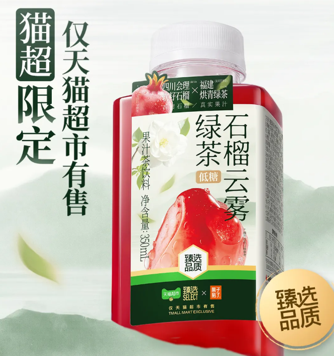 9月19日,饮品品牌果子熟了在天猫超市限定上新「石榴云雾绿茶」。新品选用四川会理软籽石榴、福建烘青绿茶与横县茉莉花,含真实果汁,采用低糖配方,口感清爽,适用于休闲、聚餐等多种场景。