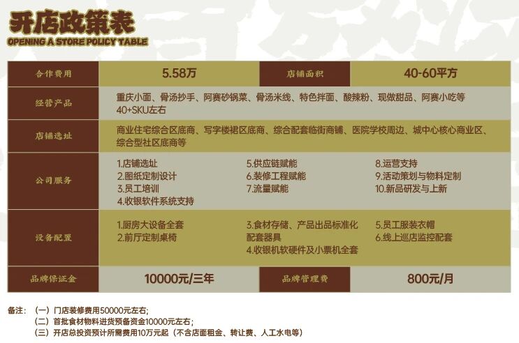 开设一家「阿赛小面」门店的总投入约为15万元,具体构成如下: