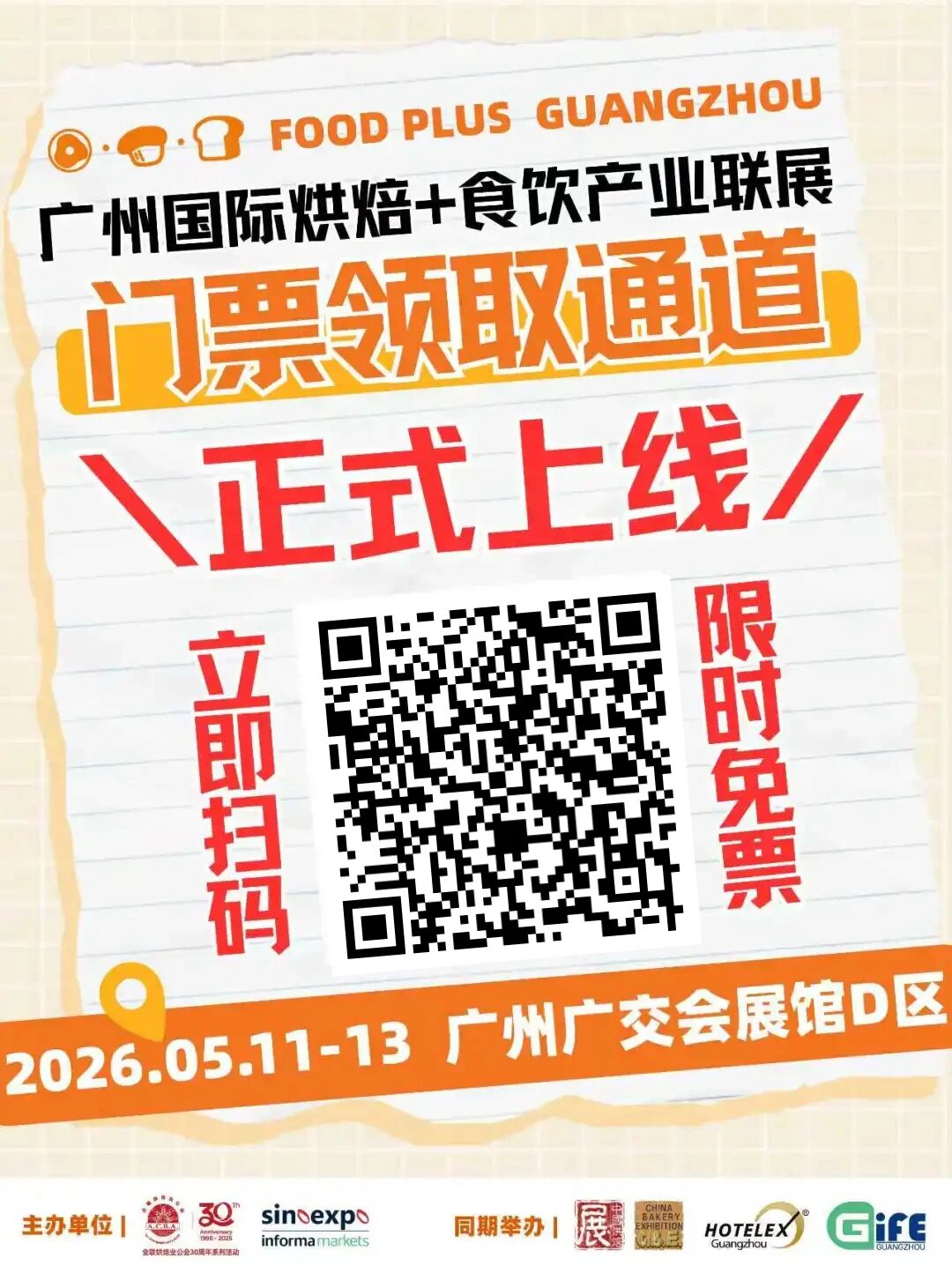 2026年5月11-13日2026第二十九届中国烘焙展览会暨FOOD PLUS广州国际烘焙+食饮产业联展将在粤港澳大湾区核心区域——广州·广交会展馆D区盛大举行,再度以联动共创模式呈现,开启烘焙+食饮产业发展的新篇章!
