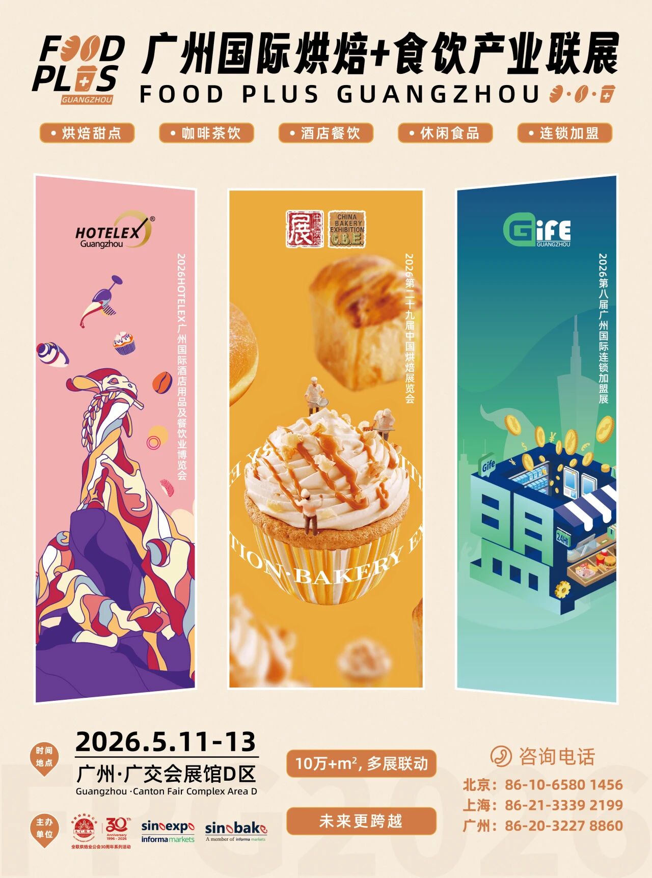 第二十九届中国烘焙展览会将携手HOTELEX广州国际酒店用品及餐饮业博览会GIFE广州国际连锁加盟展,以联动共创模式共同呈现2026FOOD PLUS广州国际烘焙+食饮产业联展,进一步释放产业潜能,助力多行业产业链融合发展,推动烘焙+食饮行业突破增长边界,通过整合全链资源、打造丰富场景、呈现多元品类,共同构建一个充满活力的“烘焙+”生态圈。在这里,上下游资源无缝衔接,参展商与专业买家将在同一平台实现多维价值的深度融合,真正实现“参展一次,链接全域,收获多重机遇”。