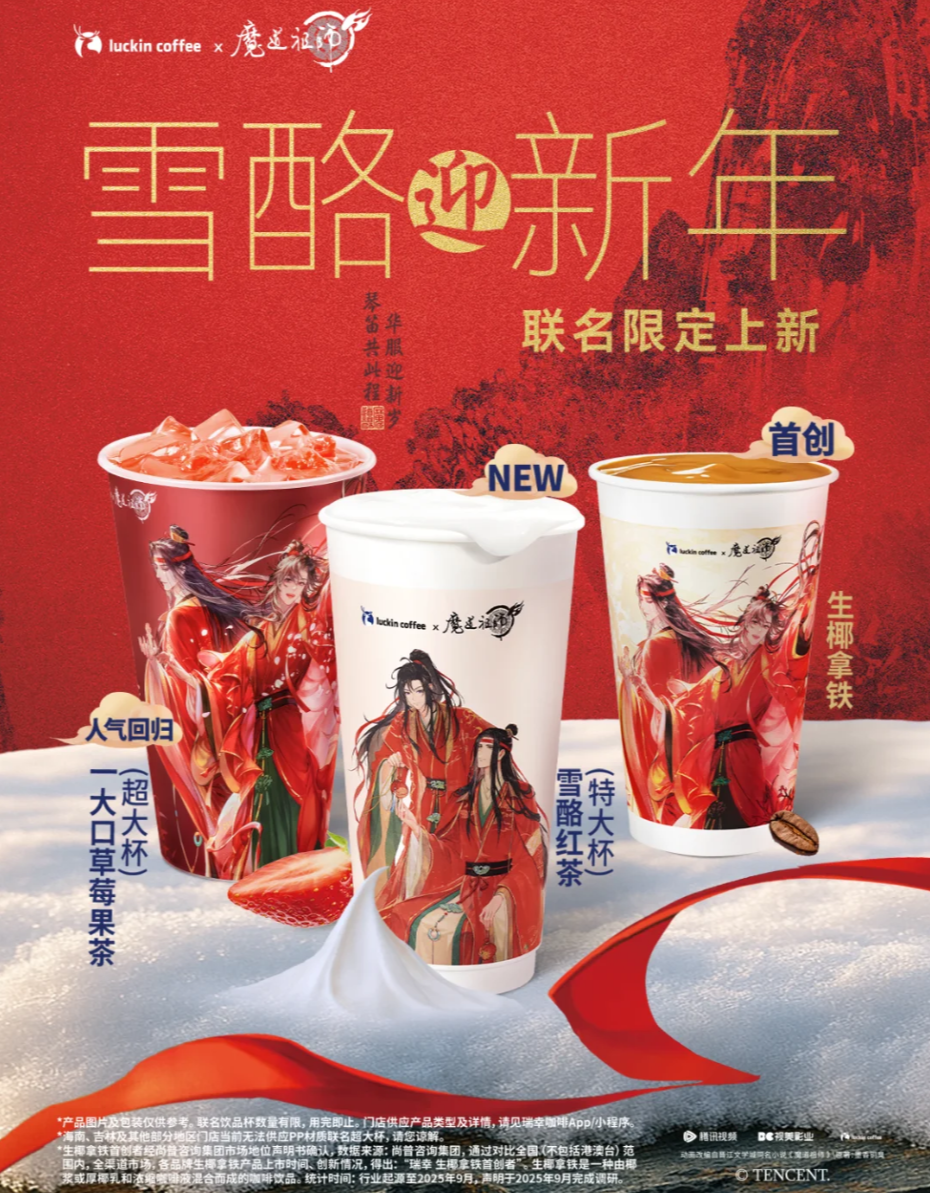 1月5日,瑞幸咖啡 x 魔道祖师动画联名上新「雪酪红茶」。