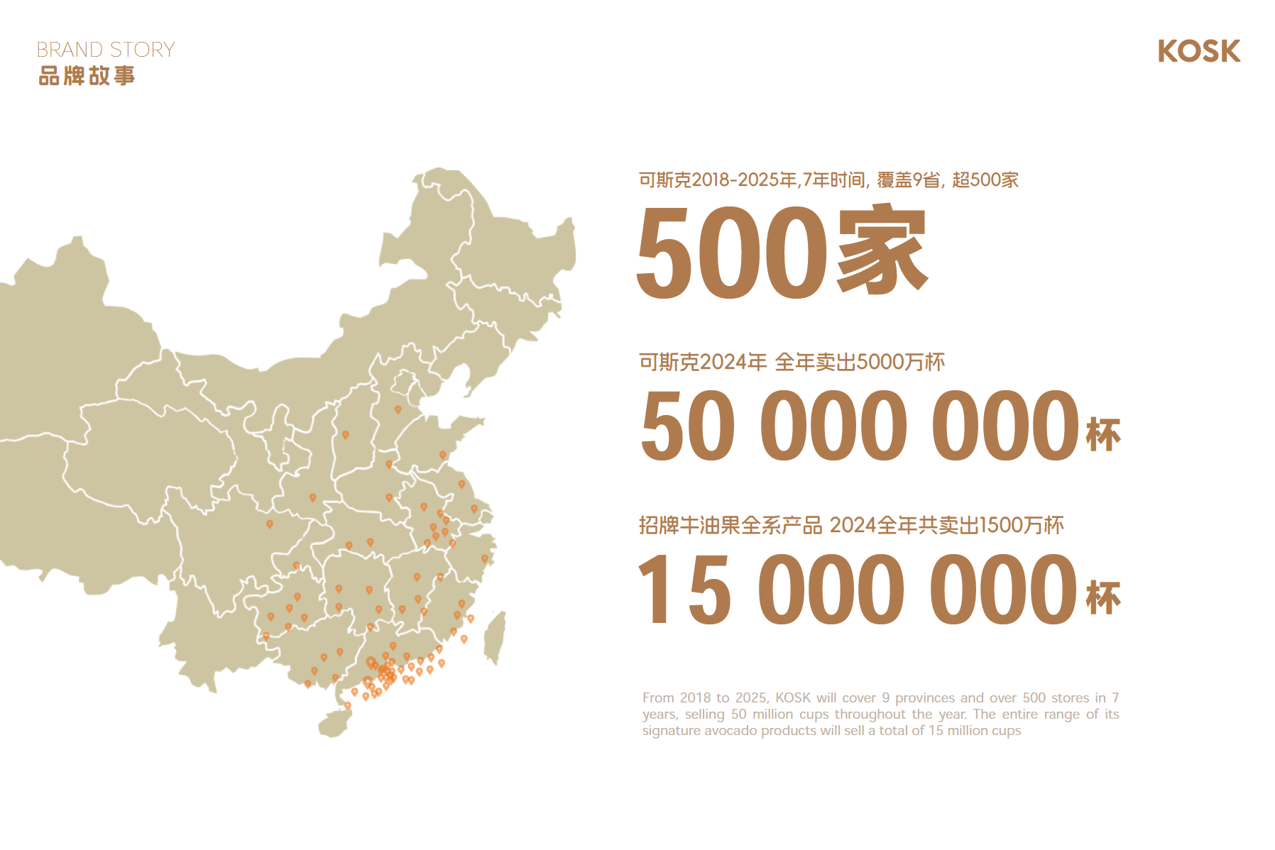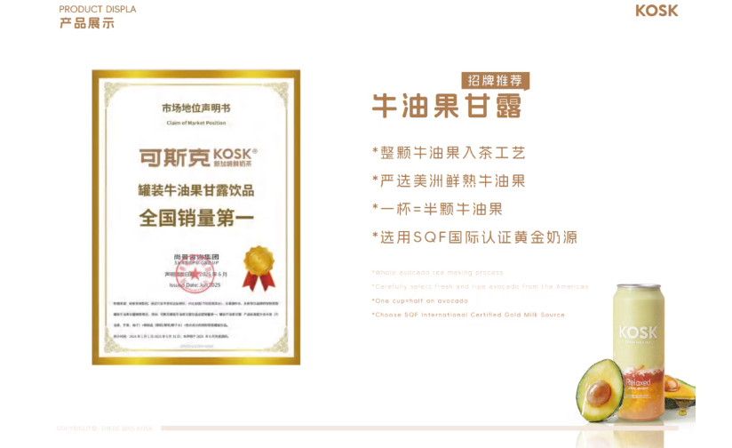 爱轻松,喝可斯克!可斯克坚持用鲜茶、鲜果、鲜奶,打造高品质茶饮。我们以“鲜奶+原叶茶”为核心基底,主打牛油果等鲜果爆品,产品围绕“健康、好喝、低负担”的口感来设计,更贴合当下年轻消费者对奶茶的追求。