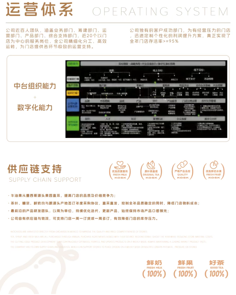 同时我们的供应链稳固,牛油果从墨西哥果园直采;茶叶、糖浆、鲜奶均与源头产地签订年度协议,品质稳定、成本可控;研发团队每周迭代产品,保持口感领先;自有供应链支持一周一订货或多订,减轻门店库存压力。