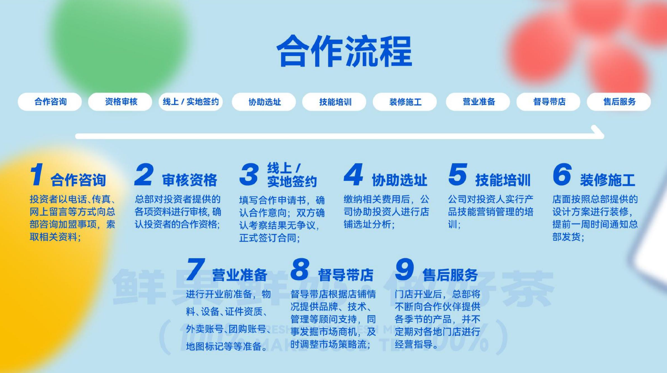 服务涵盖从前期到运营的全周期支持,包括专业商圈评估与选址、全套装修设计、总部培训与实操训练、外卖运营指导、定制开业营销方案、全年全渠道运营服务、开业物料设计、督导全年到店支持,以及持续的产品研发与供应链服务。