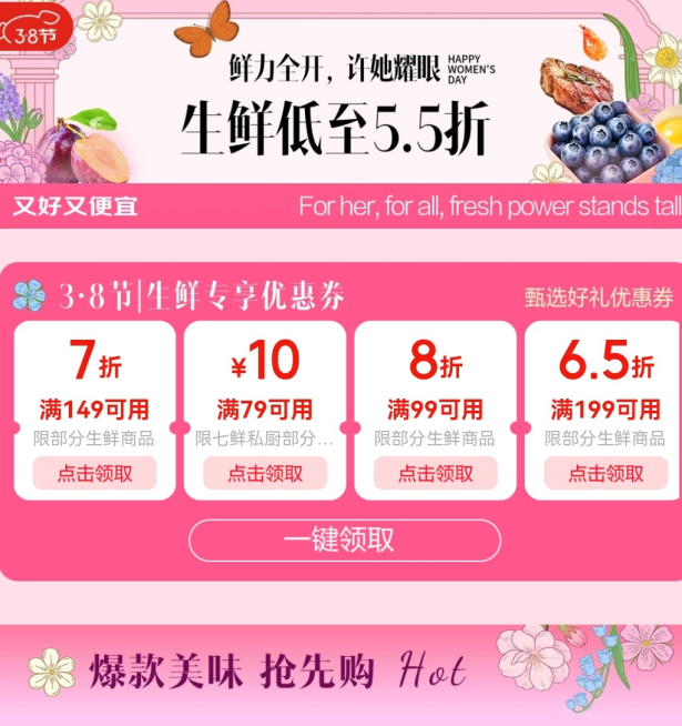 三八妇女节期间,京东生鲜推出“鲜力全开,许她耀眼”主题活动,带来满99享8折、满199打6.5折等优惠,多款爆款生鲜低至5.5折。海鲜、水果、滋补品成为女性“悦己”消费的热门三件套。